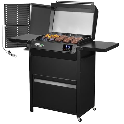 INCLUDES GRIDDLE INSERT & WHEELED CART: Comes with a durable, rust-resistant nitrided steel flat top griddle for versatile cooking, plus a custom-fit wheeled cart with side shelves for storage, mobility, and convenience.