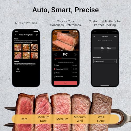 App Presets and Recipes: Customize smart alerts for your preferred doneness with hundreds of temperature settings for various meat types and cuts. Enjoy step-by-step, chef-guided video recipes to achieve perfect results every time