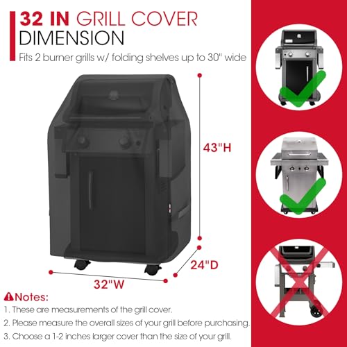 32 IN Small Grill Cover Dimension: 32"W x 24"D x 43"H, compatible with Weber Spirit 210 series grills with both side tables down. It also fits other 2 burner gas grills up to 30"W, such as Charbroil, Nexgrill, Kenmore, and more. Does NOT fit Weber Spirit II E-210 with one side table attached. Please measure your grill before purchasing