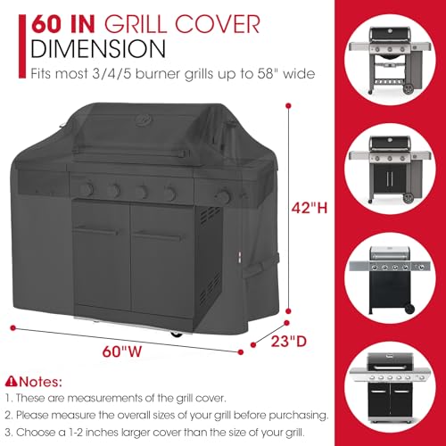 60 IN Outdoor Grill Cover Dimension: 60"W x 23"D x 42"H, designed to fit most 3-4 burner gas grills up to 58"W (53"-58" width), such as Charbroil, Nexgrill, Kenmore, Napoleon and more. Please measure your grill before purchasing