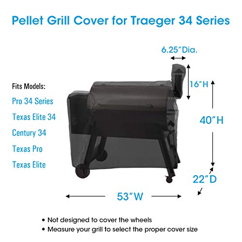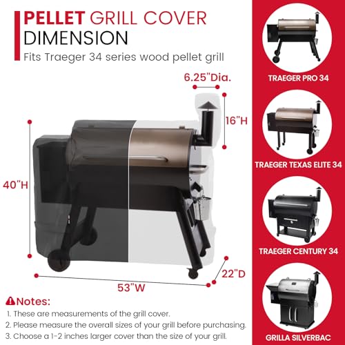 ?34 Series Pellet Grill Cover Dimension?Measures 53"W x 22"D x 40"H, compatible for most brands grills like Traeger 34 series (Pro 34 / 780 series, Texas elite 34, Century 34, Texas pro), Z grill 70002e / 450 / 550, Bighorn series, Grilla Silverbac, PitBoss 820, Members Mark, Yoder 640 and other grills with similar size.