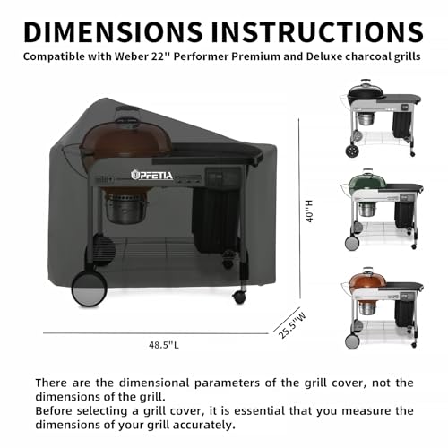 ?Perfect Fit? UPFETIA grill cover measures 48.5"L x 25.5"W x 40"H. Fits for Weber Performer Premium and Deluxe 22 inch charcoal grills, NOT FIT Performers made prior to 2005.