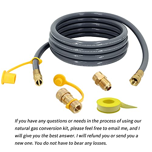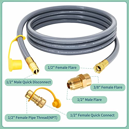 [Flexible conversion] This 12FT 1/2 Inch Natural Gas Hose with 1/2" Quick Disconnect Plug Kit x 1/2" Female Flare Fittings & 3/8" Female Flare by 1/2" Male Flare Brass Adapter. Flexible conversion, more widely adapted to your need. Please check the size of the hose and the size of the parts before purchasing.