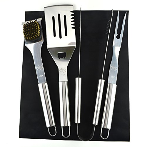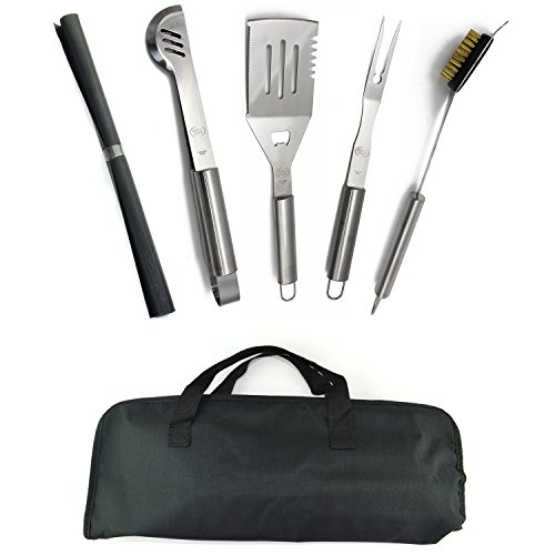 ValdoHome New Stainless Steel BBQ Grill Tools Set - 5 Piece Grilling Tool Accessories Barbecue Kit W/Carry Bag and Silicone BBQ Mat
