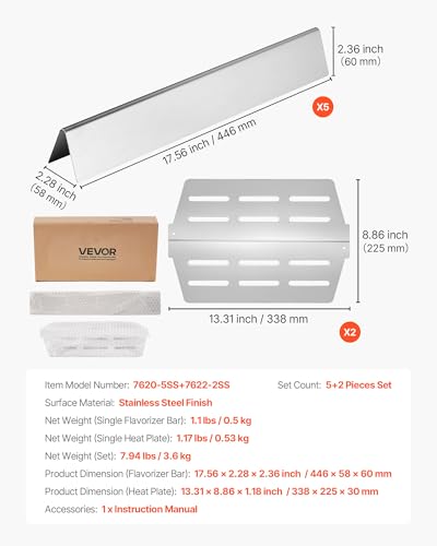 VEVOR Flavorizer Bars and Heat Deflectors, 17 inch Grill Replacement Part, for Weber Genesis 300 Series Grills, Including E310 E320 E330 S310 S320 S330, Stainless Steel Thicker Heat Plate, 7 Pack