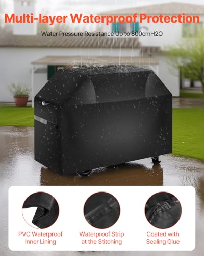 Multi-Layer Waterproof Upgrade: The barbecue cover uses a PVC lining + polyester fiber layer + waterproof layer, with all seams reinforced with waterproof strips and coated with sealing glue. It provides five layers of waterproof guard, with water resistance up to 800cmH2O. It completely blocks rainwater penetration, offering full guard for your grill and extending its lifespan