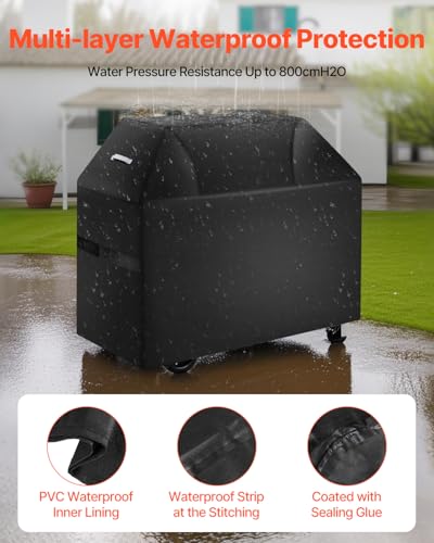 Multi-Layer Waterproof Upgrade: The barbecue cover uses a PVC lining + polyester fiber layer + waterproof layer, with all seams reinforced with waterproof strips and coated with sealing glue. It provides five layers of waterproof guard, with water resistance up to 800cmH2O. It completely blocks rainwater penetration, offering full guard for your grill and extending its lifespan