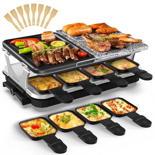 Voohek Korean BBQ Grill Raclette Table Grill Hibachi Electric Indoor Grill 2 in 1 Non-stick Grilling Plate and Natural Cooking Stone Adjustable Temperature 8 Raclette Pans 8 Wooden Spatulas 1300W