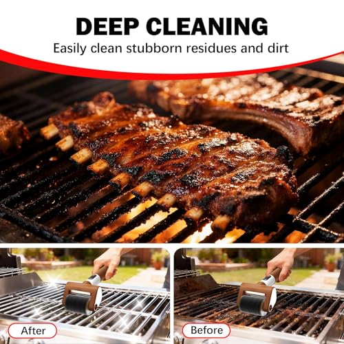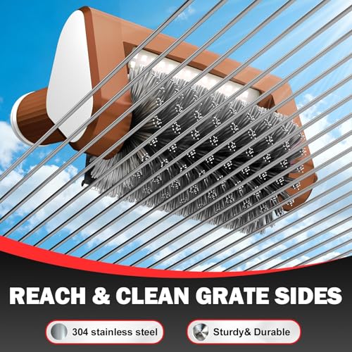 ?2 Replaceable Heads & Easy to Install? This grill cleaning tool includes 2 replaceable brush heads. One is a durable 304 stainless steel brush head, heat-resistant and corrosion-resistant. Reach and clean grill grate sides easily. No bristle shedding and ensure your food safe. The other is a scouring pad brush head, good for grill and kitchen cleaning. 2 grill brush heads can be easily and securely switched and installed.