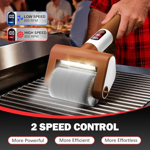 ?Powerful & Deep Cleaning? Equipped with an upgraded brushless motor, our effective BBQ grill brush cuts cleaning time by up to 70%. It features 2 adjustable spin speeds - 600RPM (For Normal Clean) and 800RPM (For Deep Clean) - one-click switch. Stubborn stains, residues, dirt and more on grill grates are removed in minutes. You'll have more time to enjoy food and life with your family and friends!