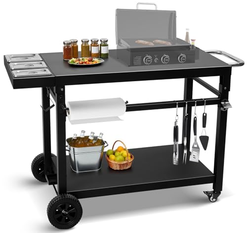 ?Sturdy & Portable Design?This heavy-duty grill table features 2 large wheels + 2 universal wheels for easy mobility,with a reinforced structure supporting 150 lbs on the cast iron tabletop and 100 lbs on the lower shelf.Perfect for moving between backyard,patio and camping sites.