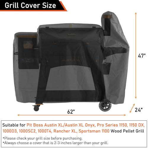 PERFECT FIT --- Measures: 62"L x 24"W x 47"H. This grill cover is tailor-made for Pit Boss Austin XL, Rancher XL, 1000XL, 1000D3, 1000SC, 1000SC2, 1000SC3, 1000Sq, Pro Series 1150, Pro Series 1100, 1000 Tradition, 1000SP Wood Pellet Grill Smoker. Please make double check with your grill size and shape before purchasing.