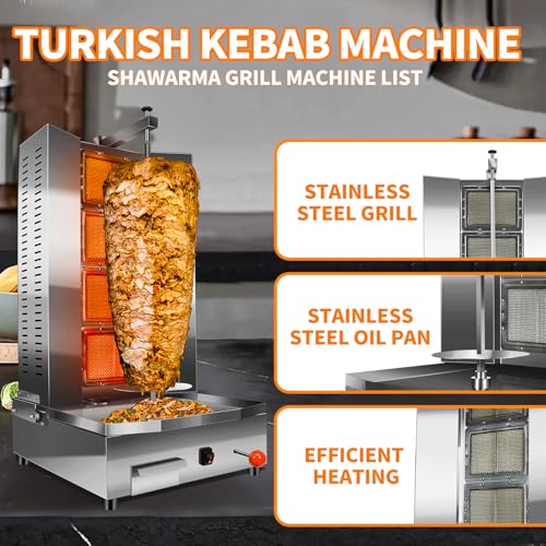 The gyro machine has a large tray and grease trap for rotisserie skewers for even roasting in all directions, height adjustable forks to hold different sizes of meat, grease container on the bottom to easily dispose of the grease, removable for cleaning, comes with a propane gas hose to connect to a gas stove.