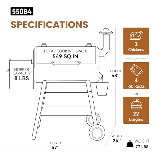 DESIGNED FOR FAMILY COOKING: 549 sq in grilling space, 8 lbs hopper capacity, 77lbs Weighs. Perfect for family to backyard BBQ.