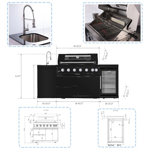 Spacious Cooking & Prep Area – This outdoor kitchen set enjoy 684 sq. inches of total grilling space with 8mm stainless steel cooking grates and a warming rack. The sleek black granite countertops provide a durable and stylish prep area, making this patio kitchen island with grill a stunning and functional centerpiece for any outdoor space.